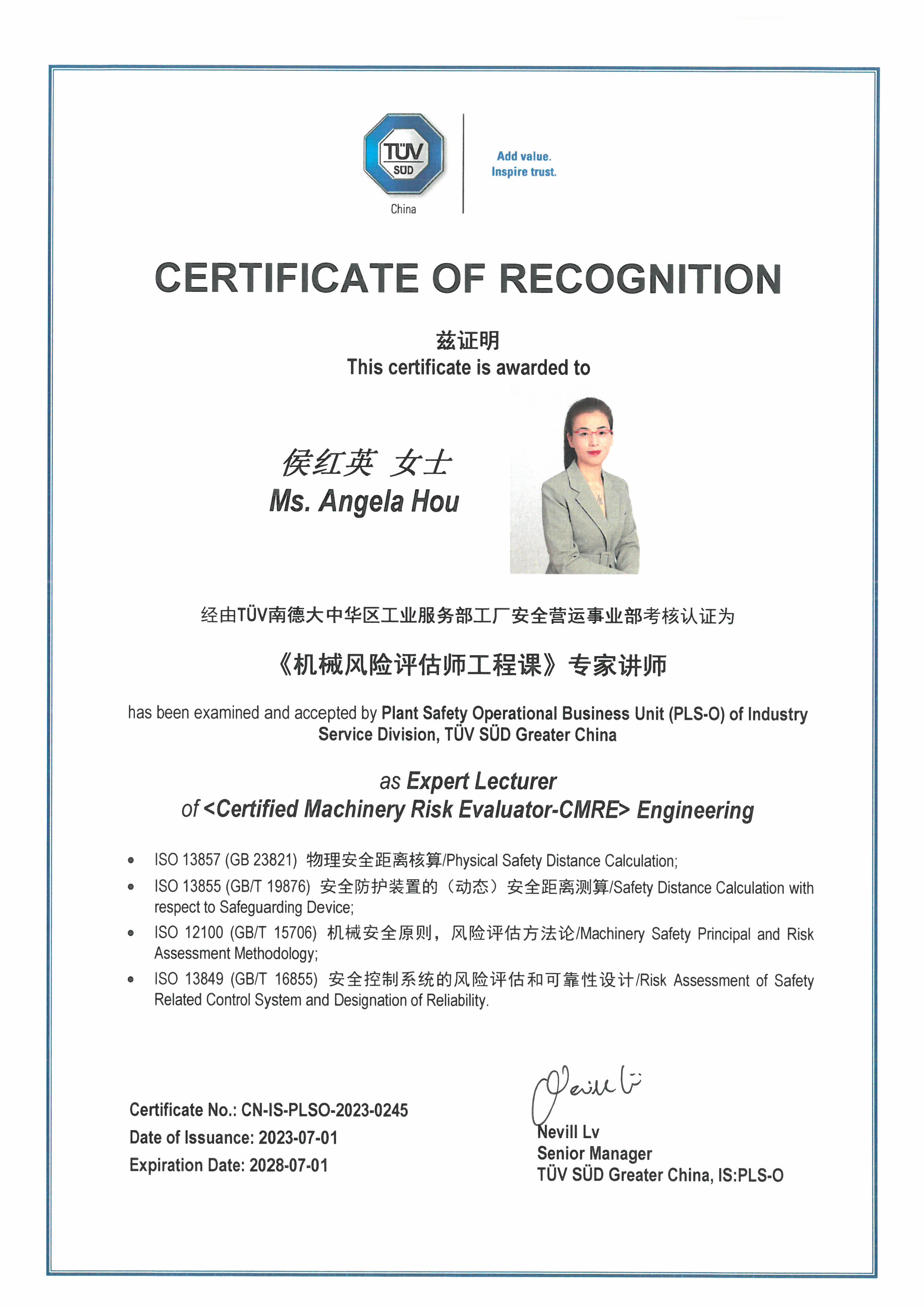 ISO國際標準 (機械安全)TC199/WG-6 Convenor 分組召集人;ISO國際標準 (機器人)TC299/WG-3 工業機器人安全標準專家。